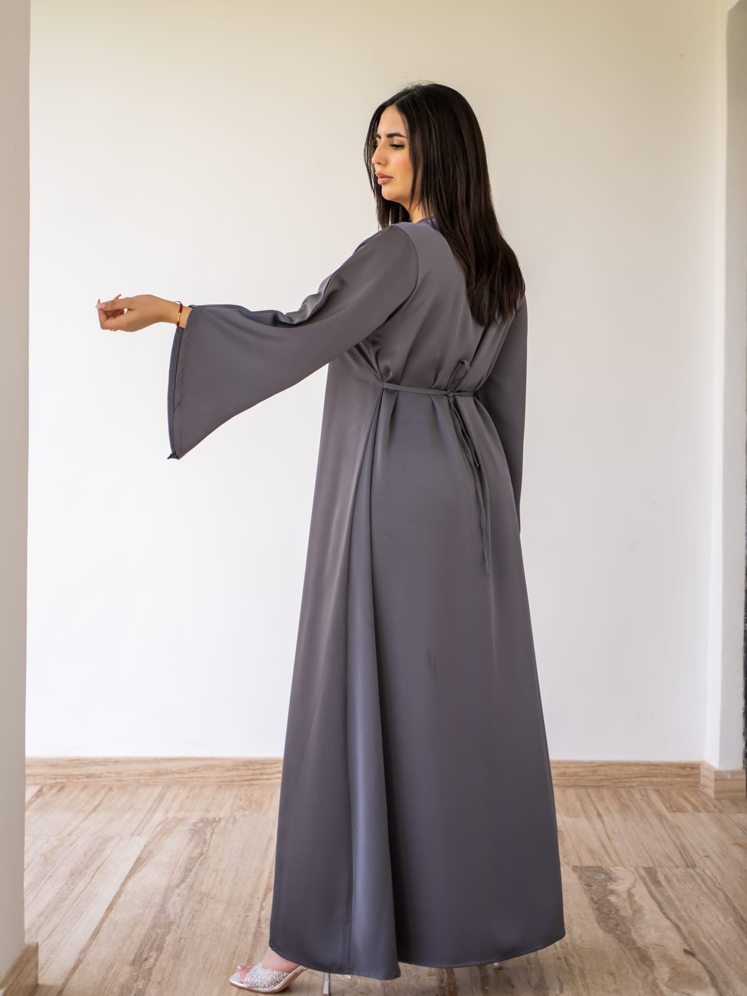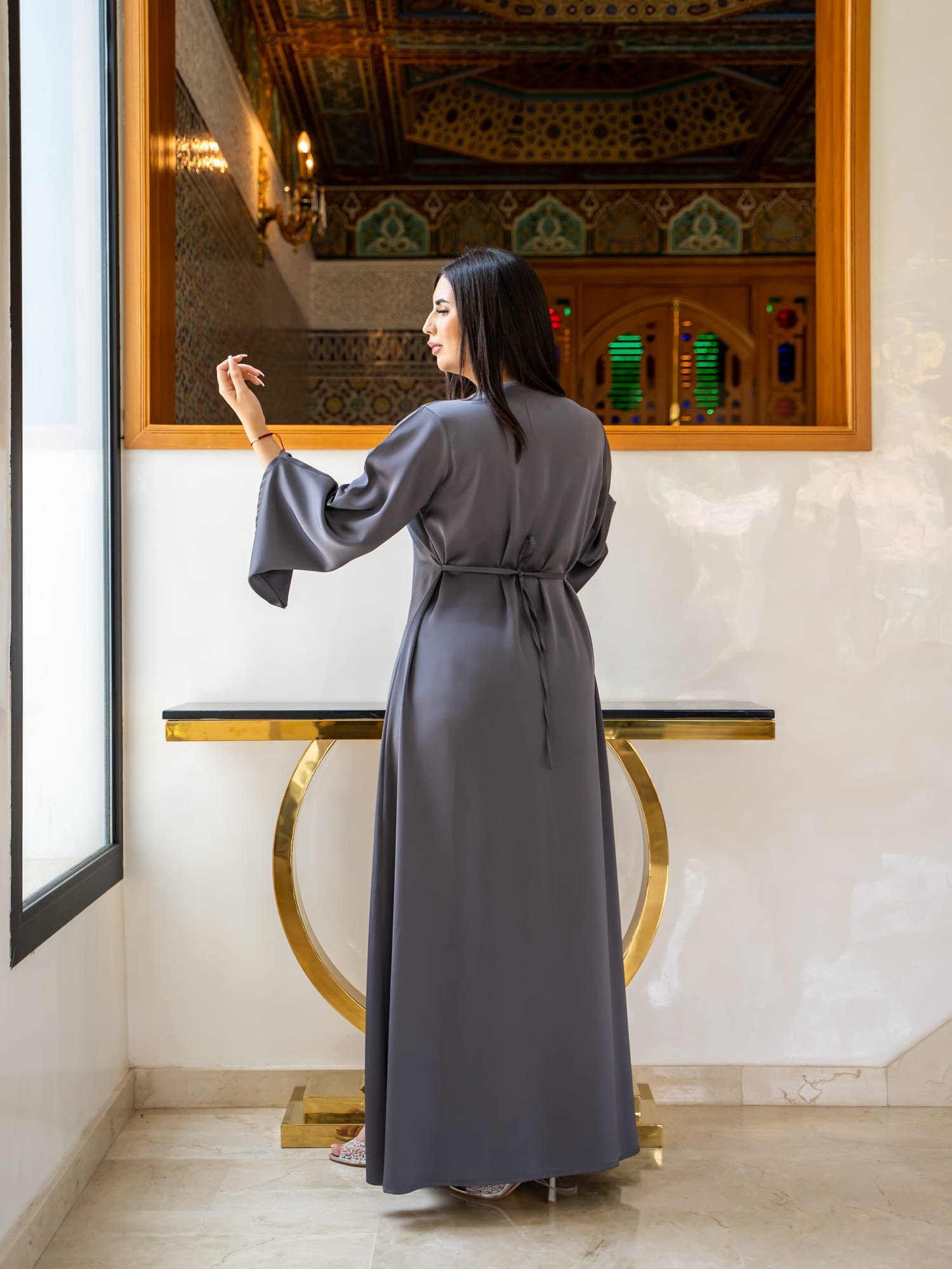 Wide, flowing sleeves create elegant movement and reflect classic kaftan styling, while the smooth charcoal grey fabric adds a contemporary, versatile touch. Free from heavy embellishment, the design focuses on clean lines and fluid form, making it suitable for both elevated everyday wear and sophisticated evening occasions.