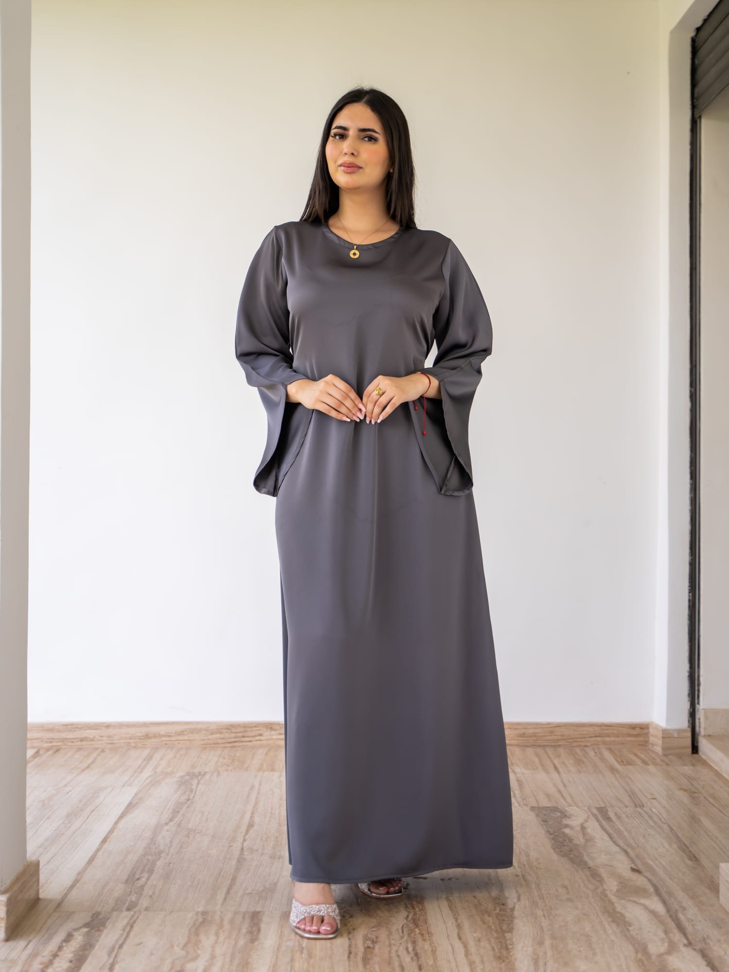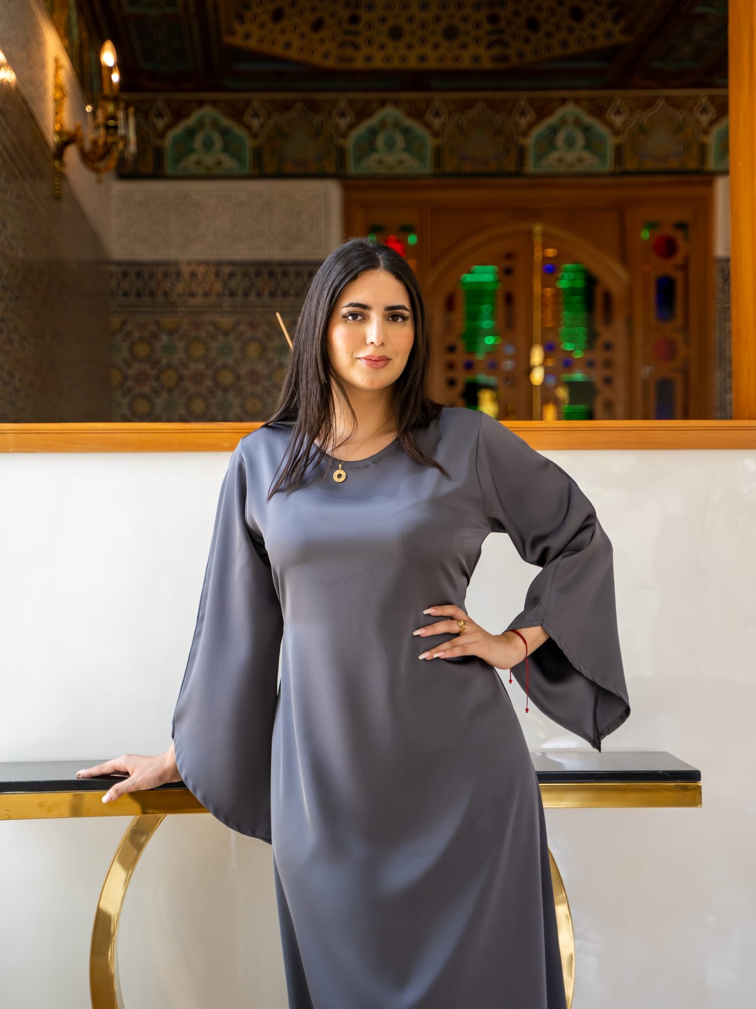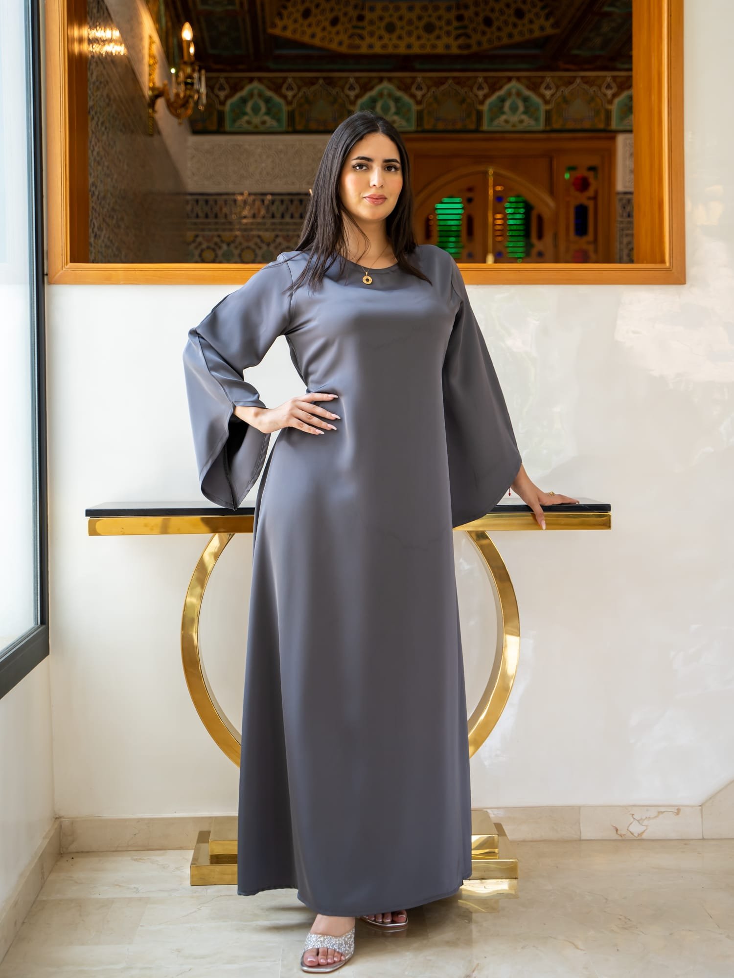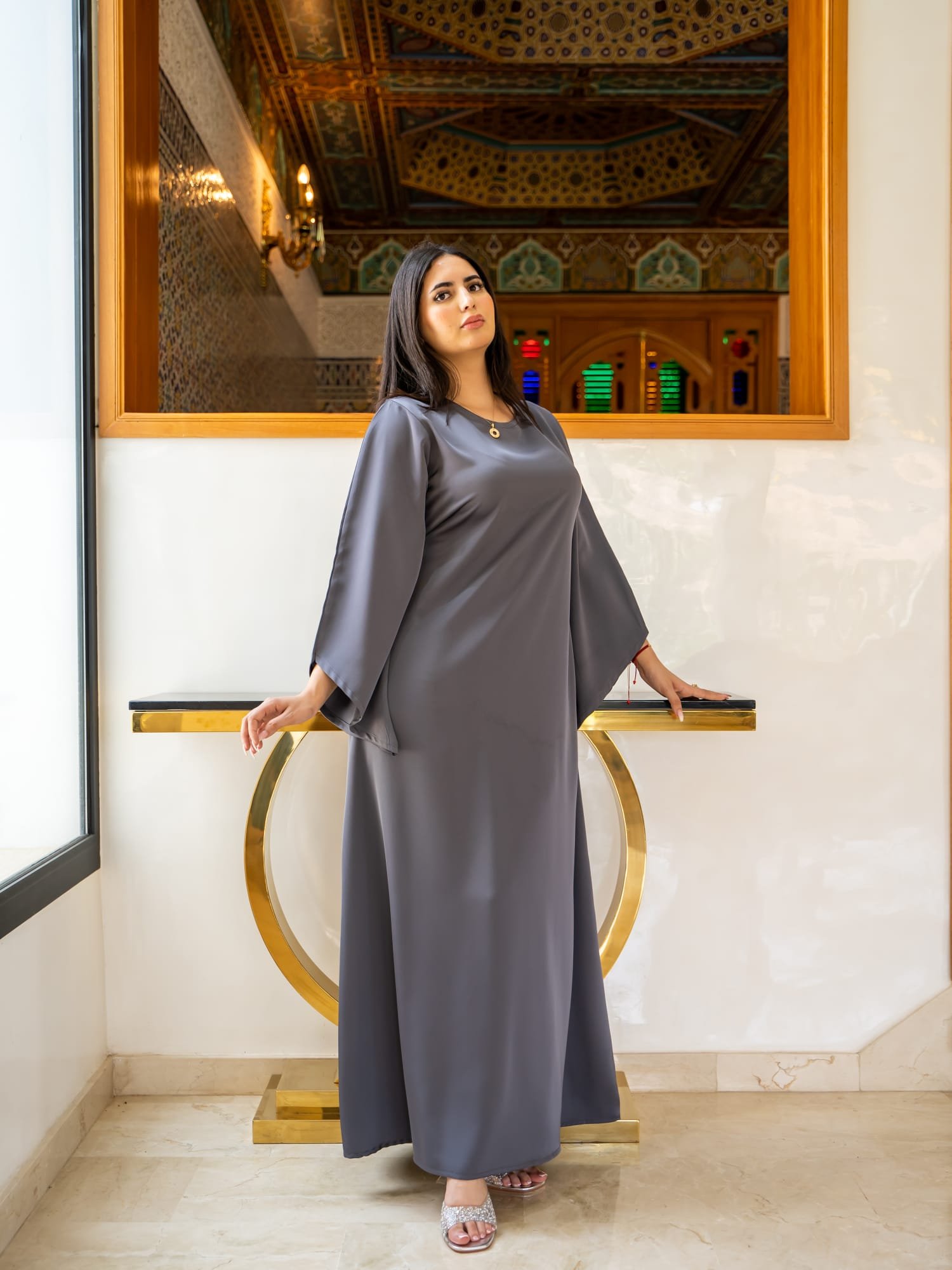 A minimalist charcoal grey kaftan featuring wide flowing sleeves and a graceful silhouette — designed for effortless, modern modest elegance.