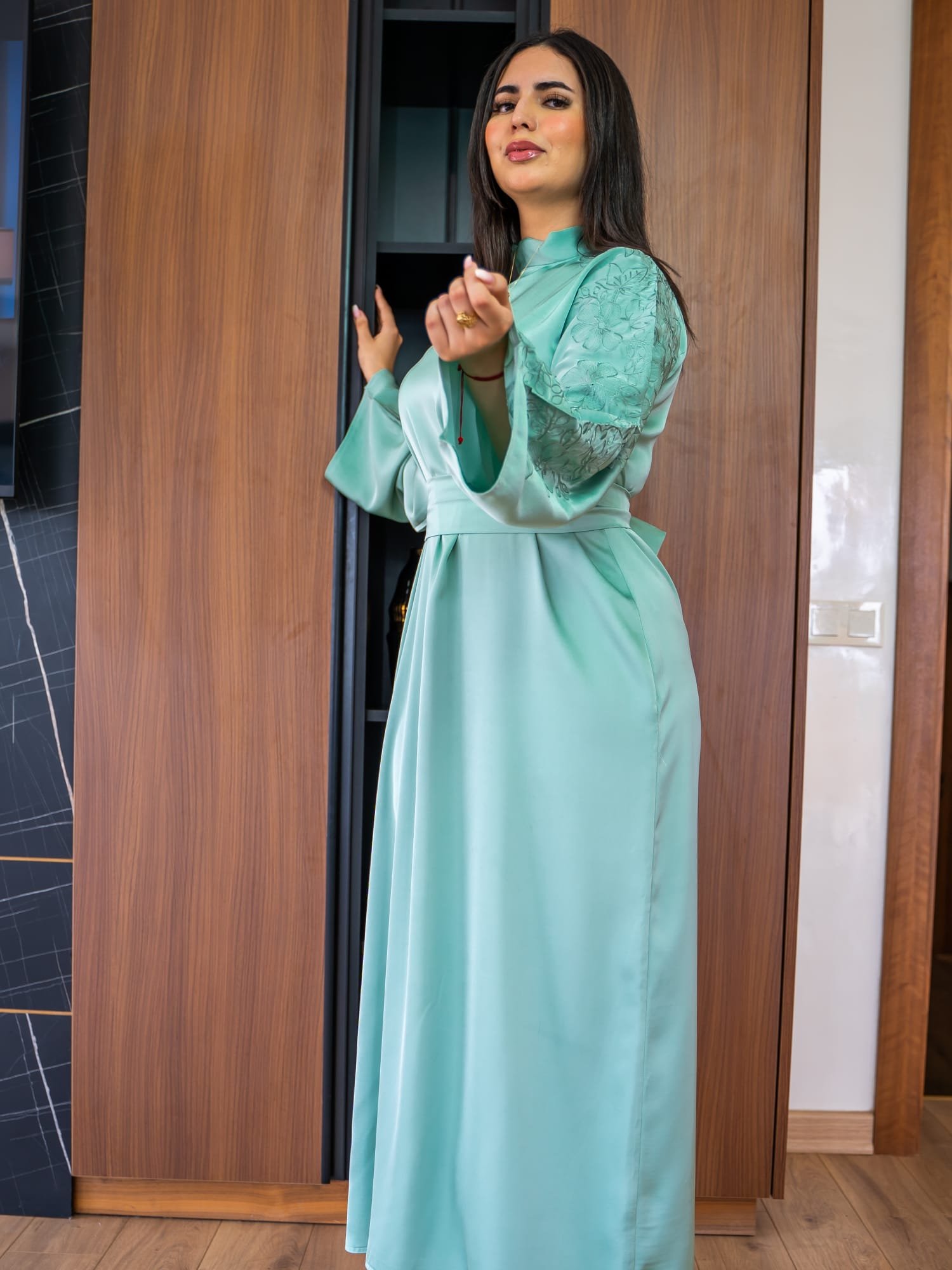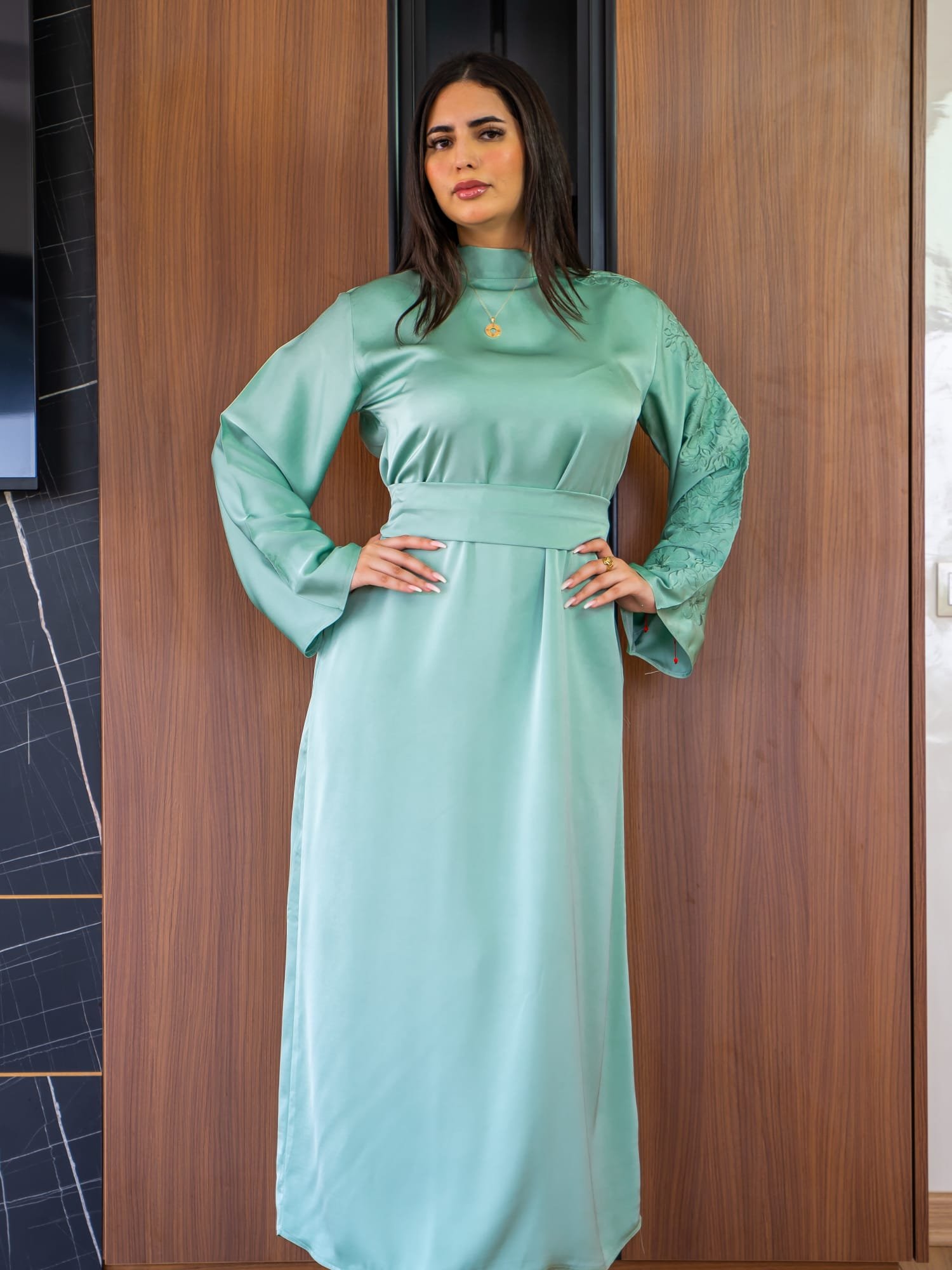 An elegant mint green maxi dress featuring a refined silhouette, subtle sleeve detailing, and timeless modest appeal.