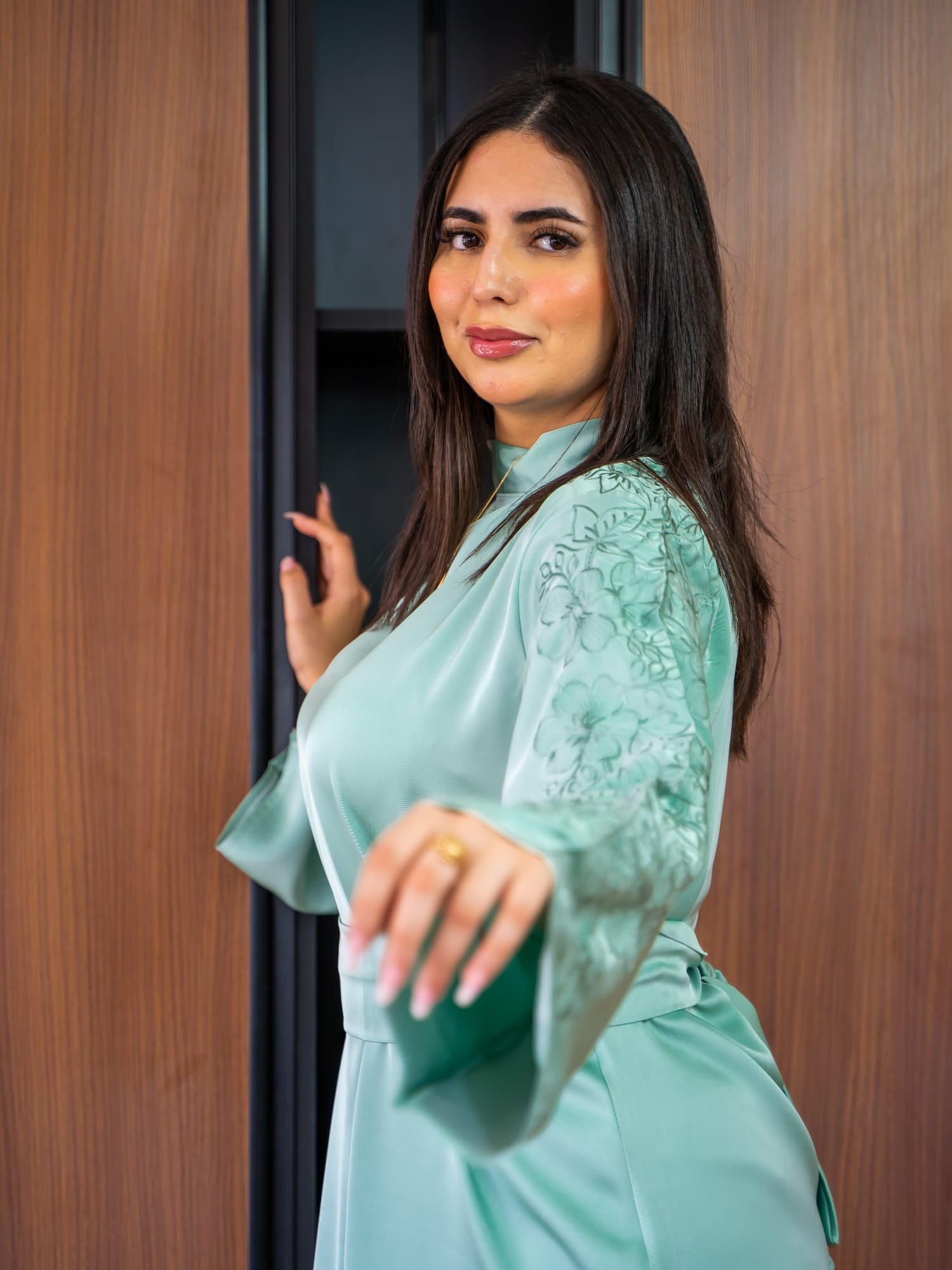 A mint green modest maxi dress offers a fresh yet sophisticated look. Its structured silhouette ensures elegance, while the soft color palette makes it perfect for both formal occasions and refined daily wear. This style is ideal for women seeking modest fashion with a contemporary finish.