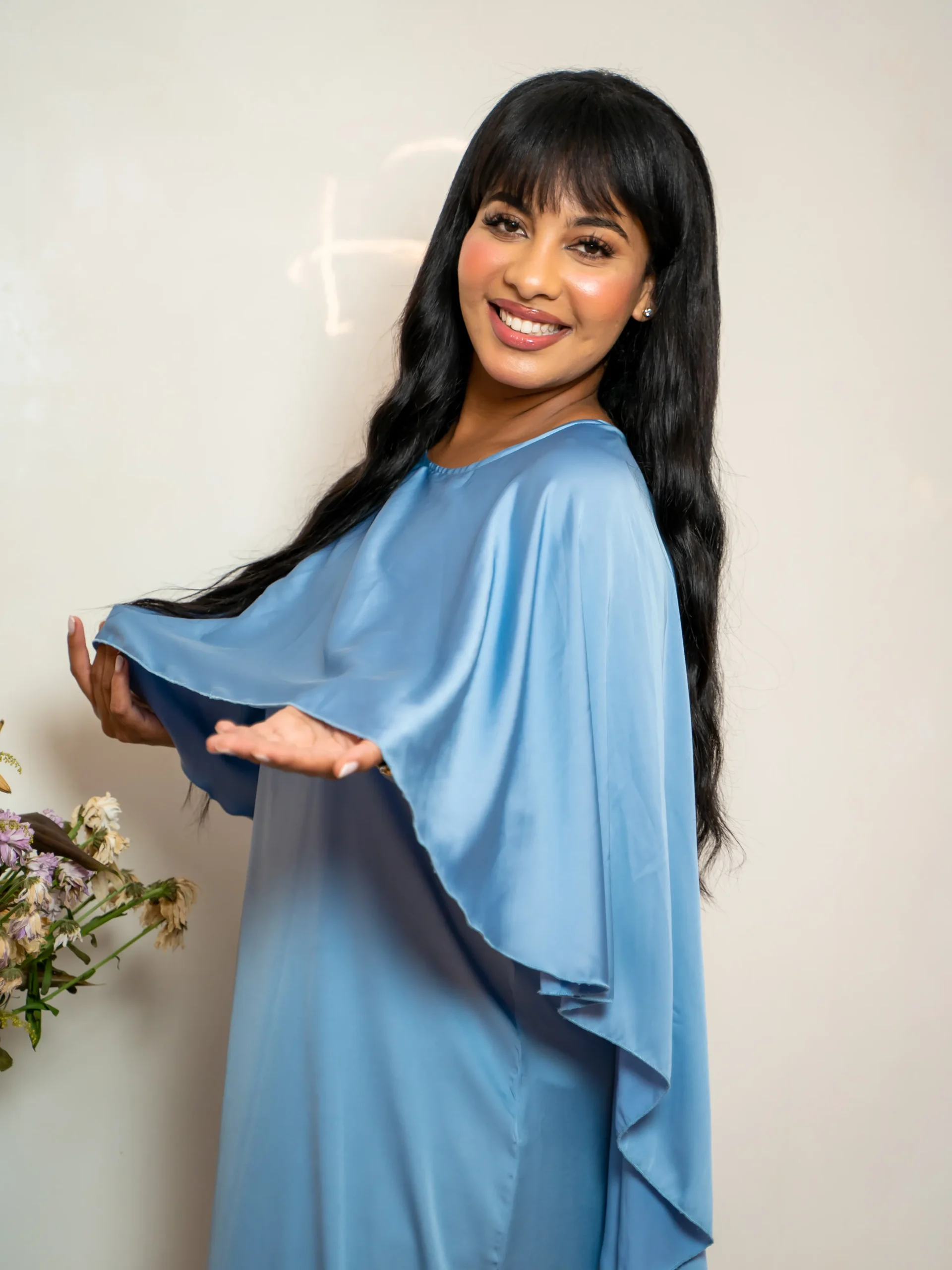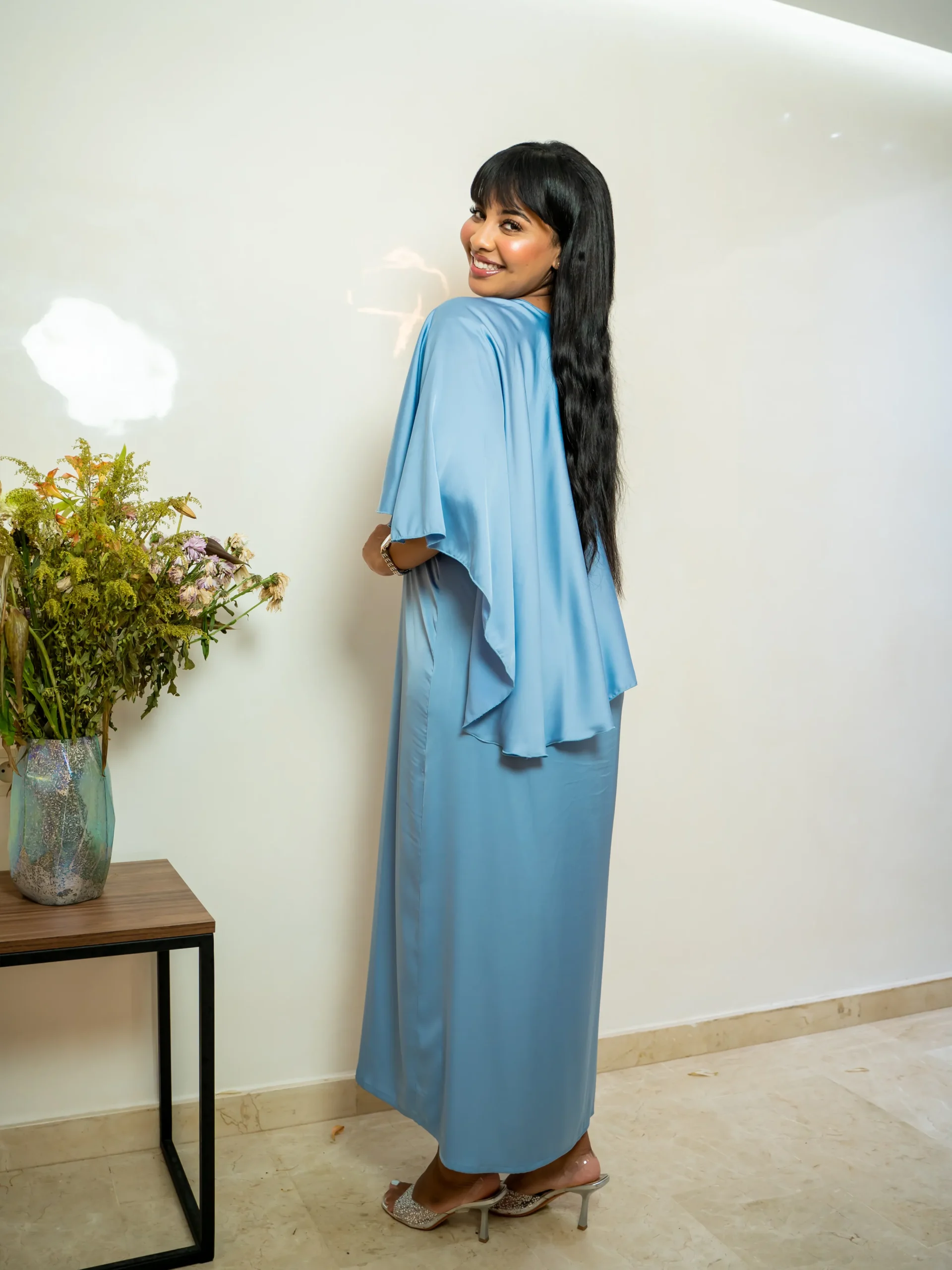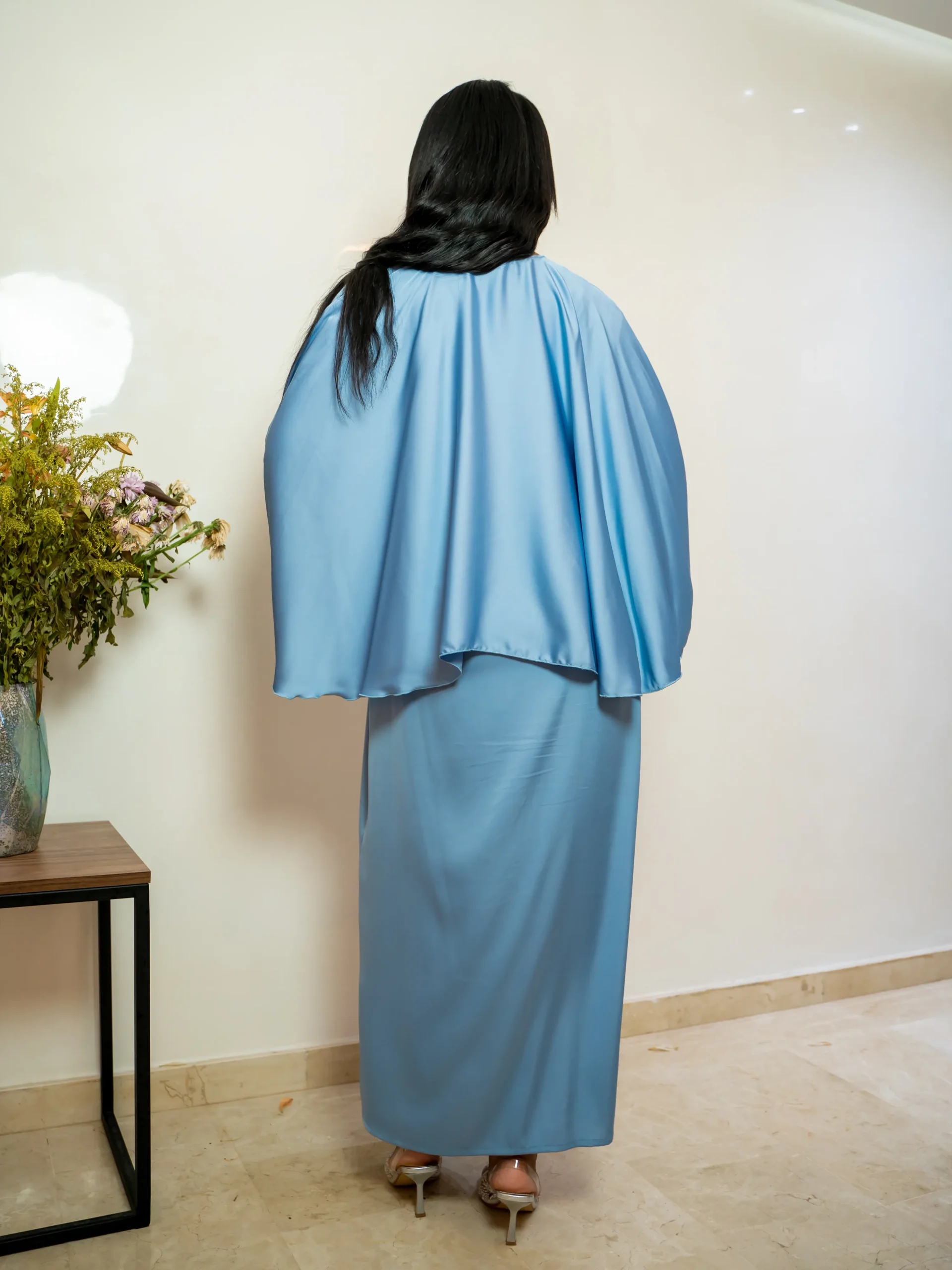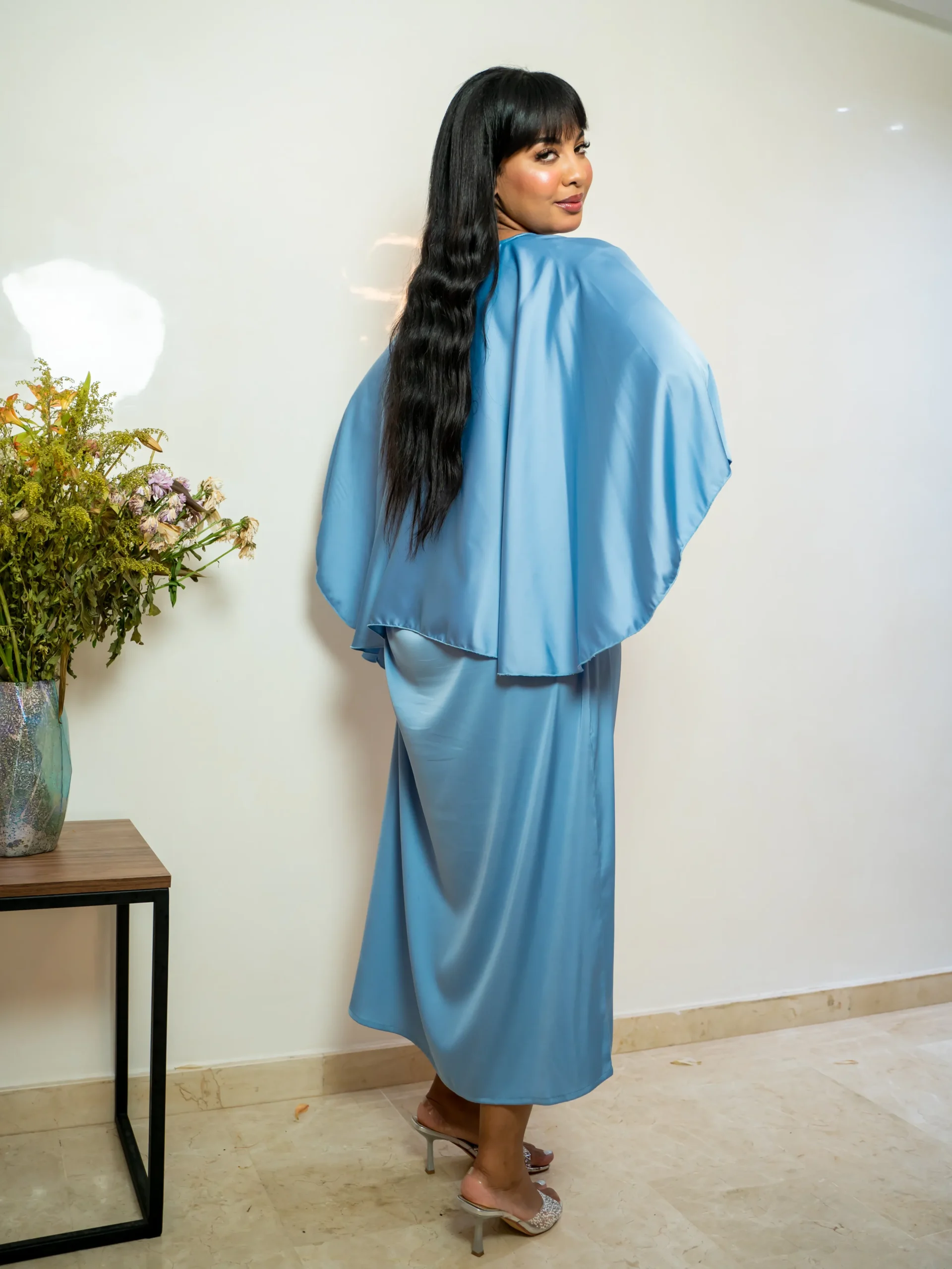 A refined powder blue maxi dress featuring a flowing cape overlay — designed for graceful movement and elegant modest wear.