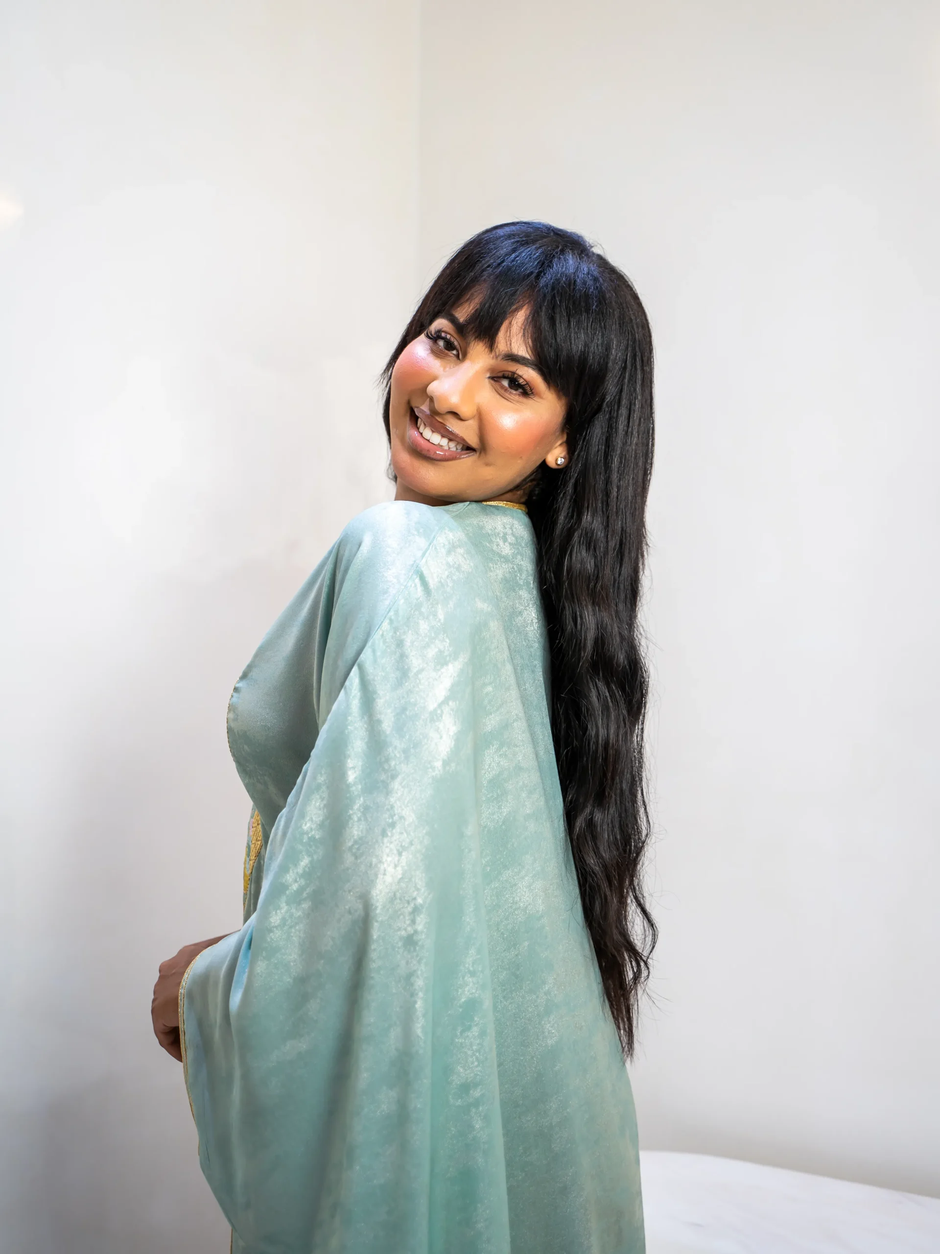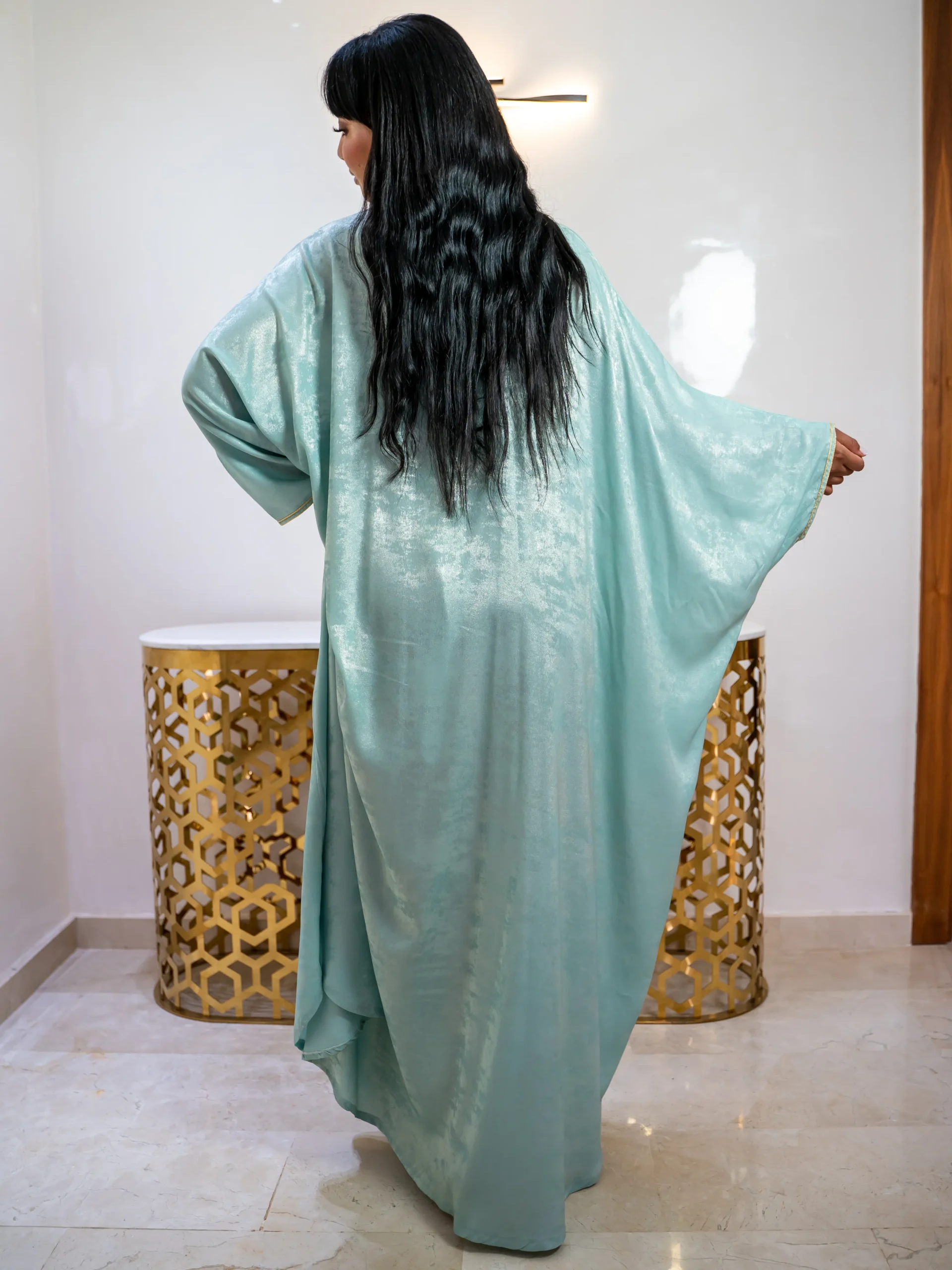 A flowing mint green kaftan featuring elegant multicolor embroidery and wide sleeves — designed for effortless modest luxury.