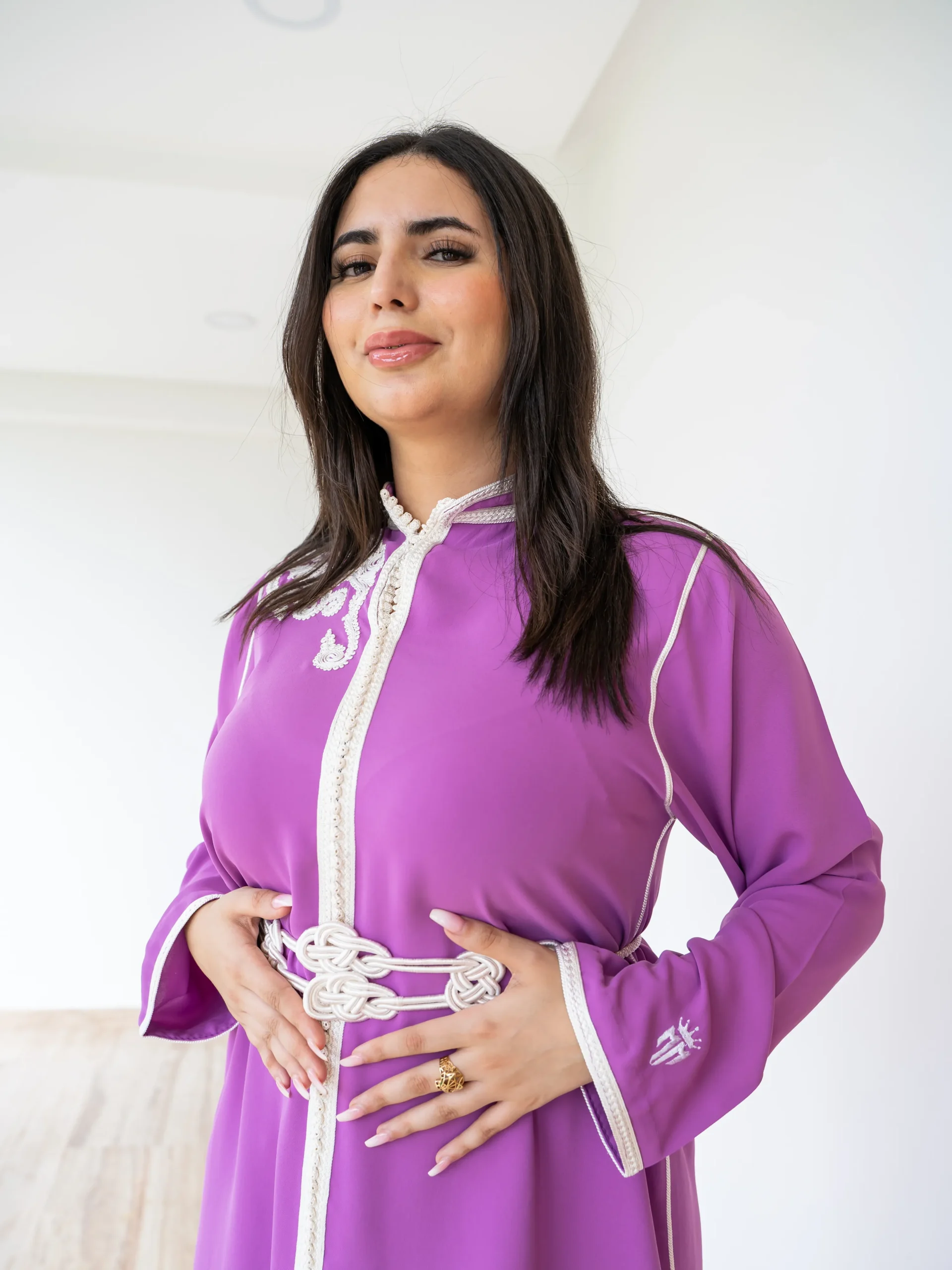 A refined purple two-piece set featuring an embroidered tunic and matching trousers — designed for elegant, modern modest wear.
