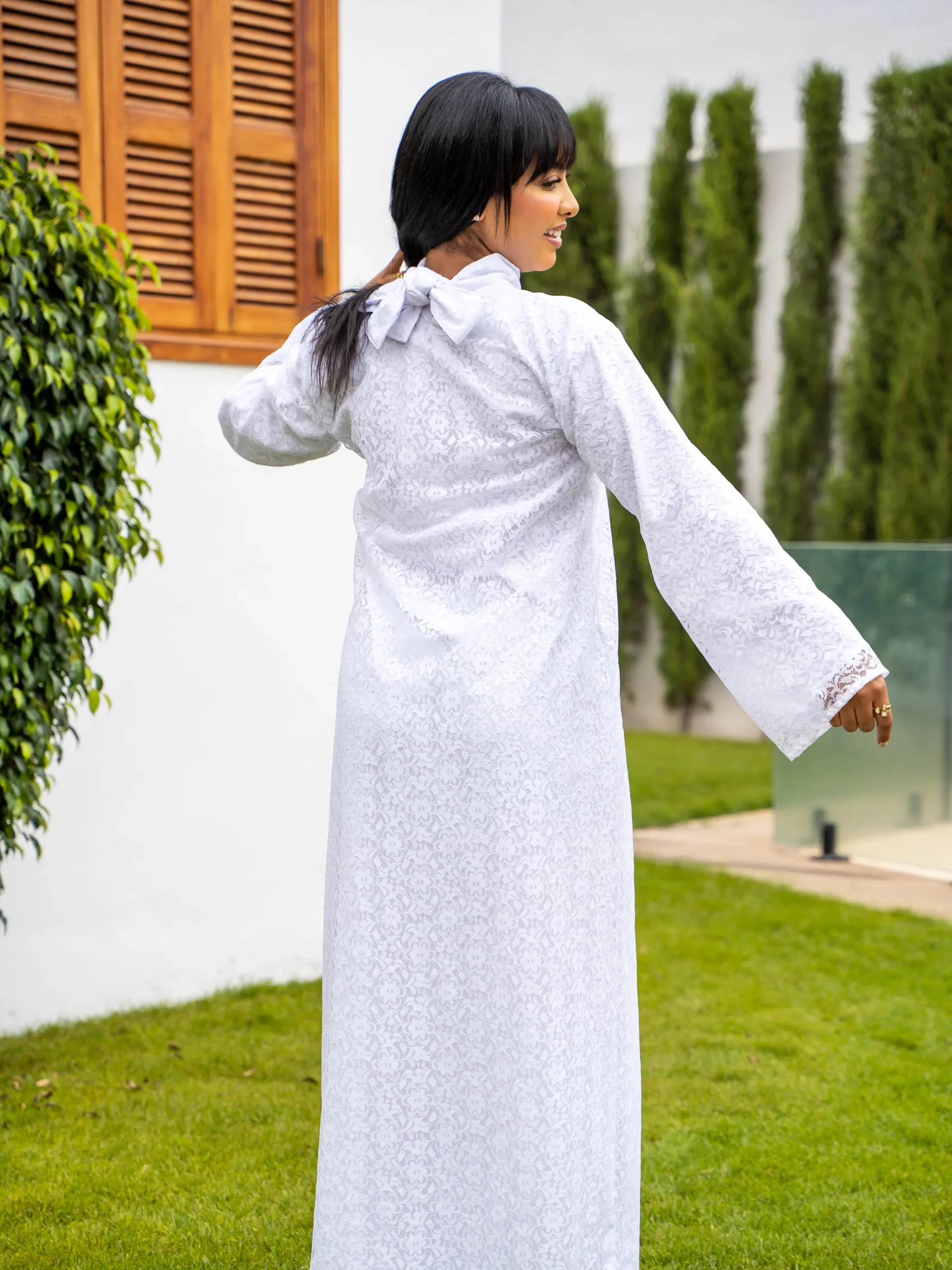 A refined white lace maxi dress featuring a clean silhouette and full sleeves — designed for elegant, timeless modest wear.